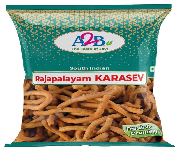 A2B Rajapalayam Karasev is a savoury Indian snack, prepared from besan dough and flavorful spices, deep fried in hot oil. A2B Rajapalayam Karasev is made from good quality ingredients and is very tasty and healthy. Enjoy the crunchiness of Karasev, spice of the pepper along with a sip of hot coffee/tea to make this a perfect evening snack with your close ones. This snack is mostly made during Diwali. Add the A2B Rajapalayam Karasev to your daily snack time to make it more interesting and fun. Explore a wide range of savoury and sweet snacks from A2B. List of Ingredients: Rice Flour, Chick Pea Flour, Refind Palm Superolein oil, Iodiest Salt, Mixed Spices Storage Instructions: Store in a clean and dry place. Country of Origin: India