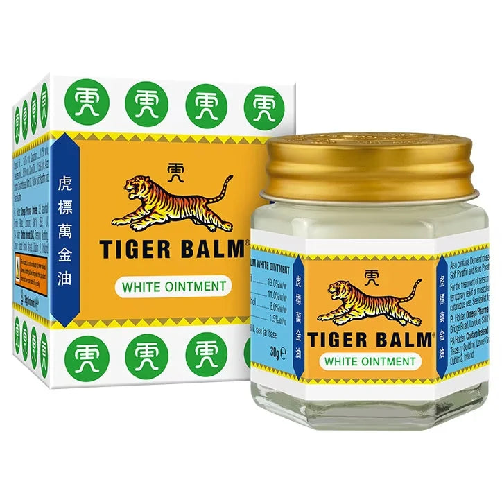 White tiger balm is an ointment made up of herbal ingredients. It is used for relieving migraines, neutralize the poisonous stings of insects as well as an insect repellent for mosquitoes. When left open, the odor causes a hostile environment for the insects and makes them flee away. Tiger balm white can also be used to relieve inflammations from insect bites like bedbugs, termites, safari ants, among others. Children above the age of two years and adults are the ones recommended to use tiger balm white.How to use:1. Clean the affected area.2. Take a small amount: Scoop a small amount using your fingertips.3. Apply gently: Rub the Balm onto the affected area using gentle circular motions. Avoid applying too much pressure.4. Massage in: Massage the balm into the skin until it is absorbed. You may feel a warming or cooling sensation.5. Wash your hands: After applying Balm, wash your hands thoroughly to avoid accidentally touching your eyes or other sensitive areas.6. Reapply if necessary: Depending on the severity of your discomfort, you may need to reapply balm every few hours. Follow the instructions on the packaging for guidance on frequency of use.Key ingredients:Tiger balm white is composed of pure herbal ingredients. It is made up of with :25% Camphor8.0 % Menthol1.43% Clove oil13.0% Eucalyptus oil.The ingredients have powerful effects to relieve pain.Camphor has a strong aroma and is poisonous to insects. The presence of camphor in the tiger balm white makes it effective as an insect repellent.Menthol is extracted from mint oil which is obtained from peppermint and corn mint. Menthol is a unique composition in tiger balm white used to treat nasal congestion.Eucalyptus is made from the leaf of the eucalyptus plant. Its inclusion in the tiger balm white is vital in the treatment of cold, asthma, carminative, cold and expectorants. Weight: 30g. Country of Origin:India.