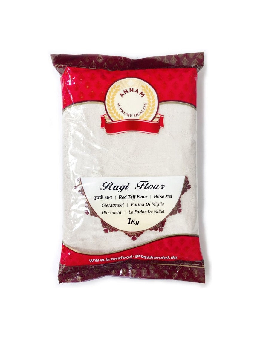 Nutritious finger millet flour (ragi) from Annam. Rich in calcium, fiber, and iron. Used in dosas, porridge, and rotis. A great gluten-free grain for healthy diets. Store in airtight container. Naturally gluten-free and packed with iron, it's great for growing kids. Use it to prepare healthy pancakes, roti or laddus.