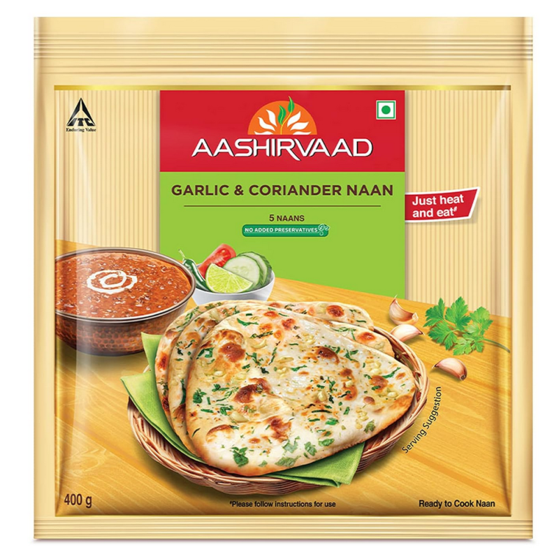 Enjoy the authentic taste of tandoor-style naan with Aashirvaad Garlic & Coriander Naan. Soft, fluffy, and flavored with fresh garlic and coriander, this naan is ready to heat and serve, pairing perfectly with your favorite curries, kebabs, or gravies. A delicious and convenient meal addition for the whole family!Number of pieces :5