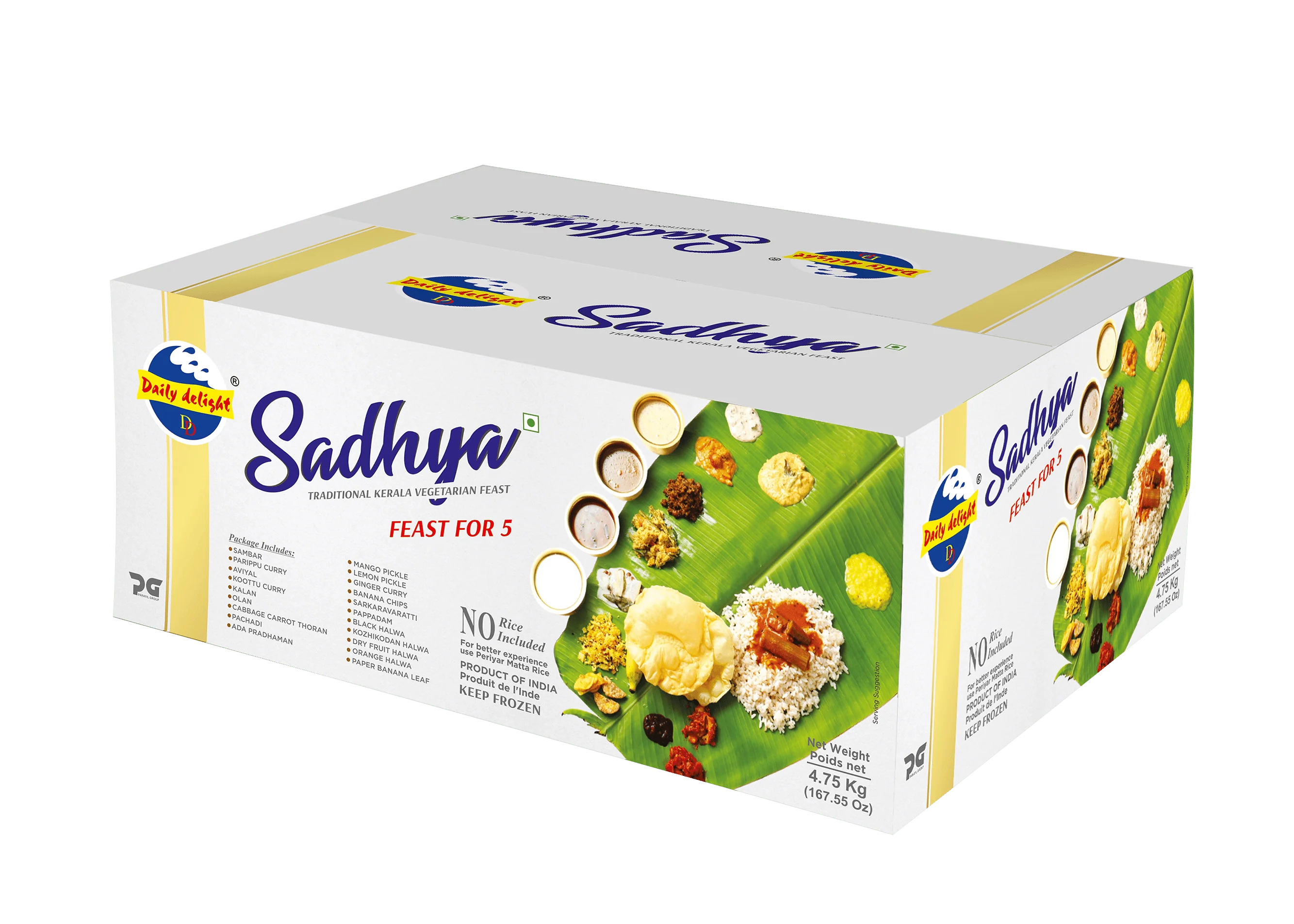 A grand festive meal kit featuring traditional Kerala dishes served during Onam. The box includes 20+ items like avial, olan, sambar, and payasam. Fully cooked and frozen — just heat and serve. Perfect for family celebrations. Authentic, convenient, and preservative-free.