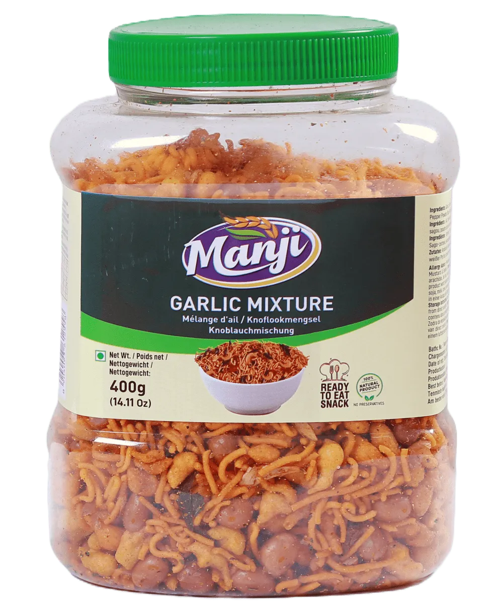 Spicy and crunchy South Indian mixture with roasted garlic pods. Manji Garlic Mixture adds bold flavor to tea-time snacking. Made with sev, peanuts, and fried curry leaves. No artificial flavors. Resealable for freshness.