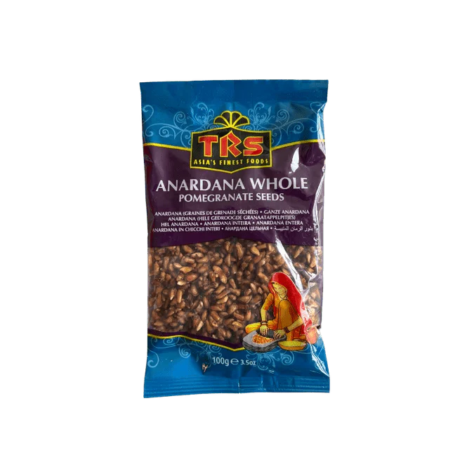 Whole dried anardana (pomegranate seeds) from TRS, 100g. Tangy and slightly sweet, these are perfect for chutneys, spice blends, and North Indian gravies. Adds a unique depth to dishes while aiding digestion naturally.