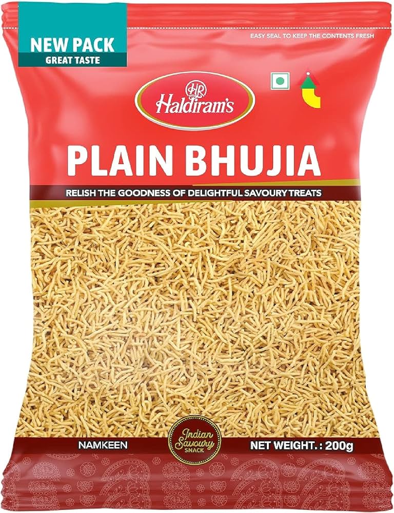 Classic bhujia sev made from gram flour and traditional Indian spices. Haldiram’s Plain Bhujia is crispy, mildly spiced, and versatile. Use as a snack or topping for chaat. Vegetarian and shelf-stable. No preservatives added.